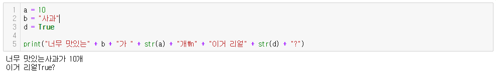 a에 10이라는 정수를, b에 사과라는 단어를, c에는 3.21라는 실수를, d에는 bool형인 True를 넣어봤습니다.