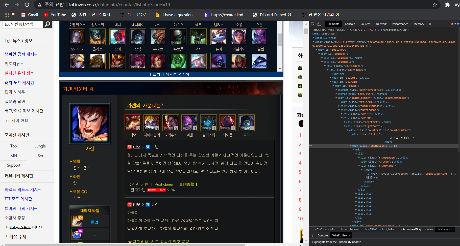 먼저 카운터를 가져올 사이트를 크롤링합니다. (이번 포스팅에서는 롤 인벤 사이트를 참고하여 제작하겠습니다.)